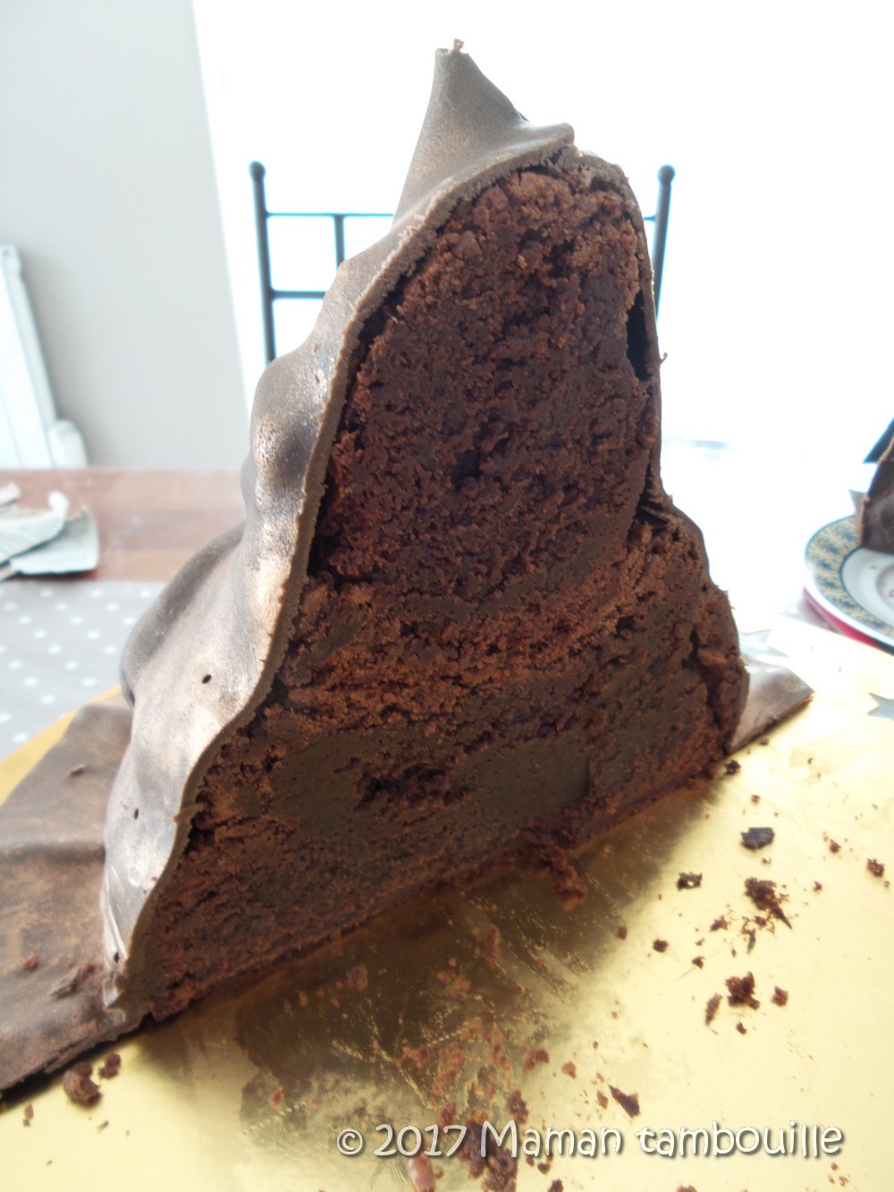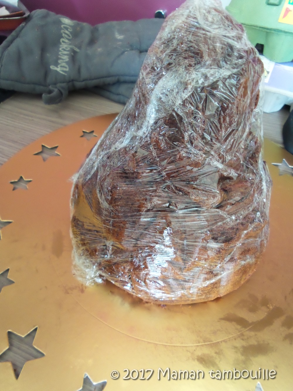 J’ai connu quelques galères pour le faire et notamment pour le couvrir de pâte à sucre. J’étais partie sur un disque que je voulais poser sur le gâteau puis modeler en forme de chapeau une fois dessus mais ma pâte se déchirait de partout et il m’était impossible de réaliser une pointe en haut. Finalement, j’ai trouvé la solution avec un demi cercle qui vient entourer le gâteau et qui, du coup, forme une pointe en haut naturellement.