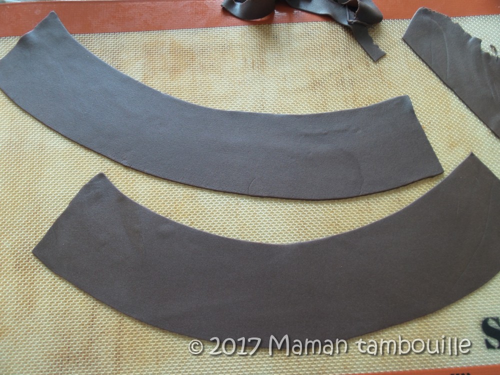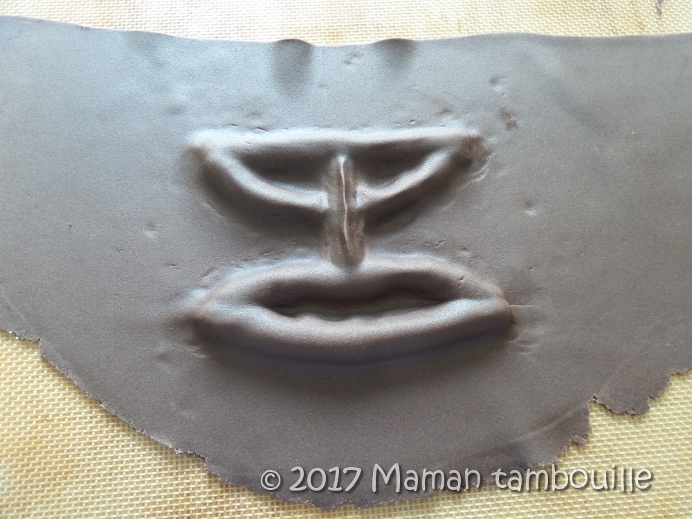 Etaler le reste de pâte marron. Couper 2 bandes en demi lune comme sur la photo.