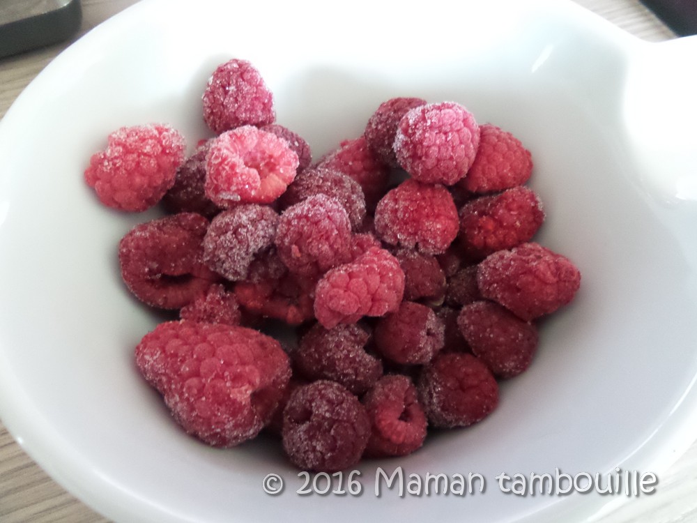 Ajouter les framboises dans le saladier de 300g (celui avec la levure rose) et bien fouetter au batteur pour mélanger.
