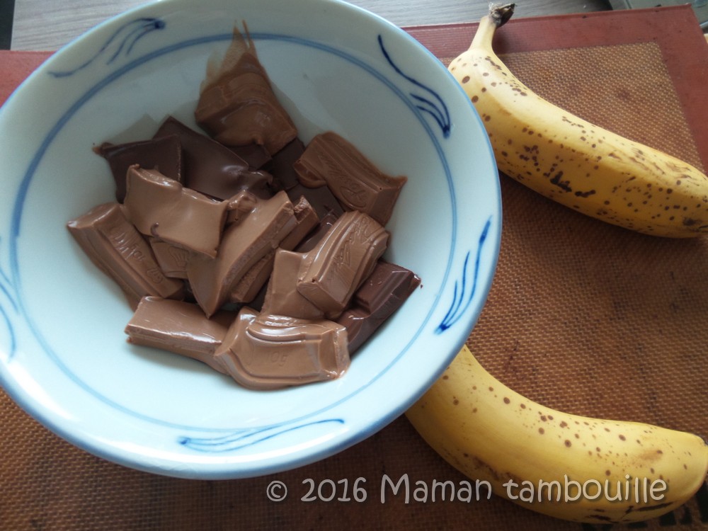 Mélanger les chocolats. Ajouter les bananes et les écraser à la fourchette.