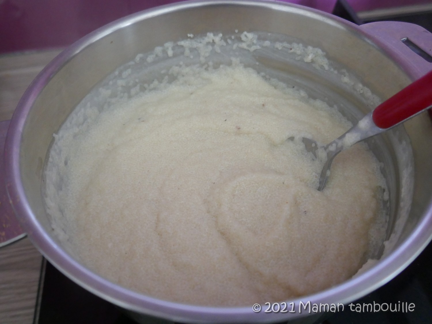 Mettre le lait à bouillir avec la fève de tonka râpée. Verser la floraline en pluie et cuire 2 min à petits bouillons en mélangeant.