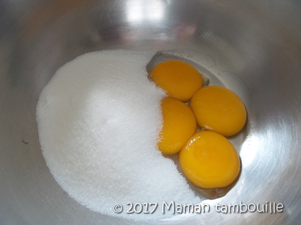 Dans un saladier, mettre les jaunes d’oeufs avec le sucre et une cuillère à soupe d’eau.