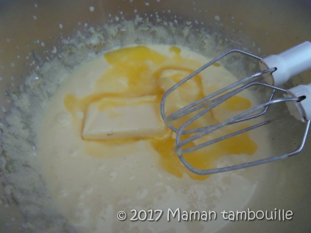 Fouetter jusqu’à ce que le mélange blanchisse et mousse et ajouter le beurre fondu (il doit être juste fondu mais surtout pas chaud). Fouetter.