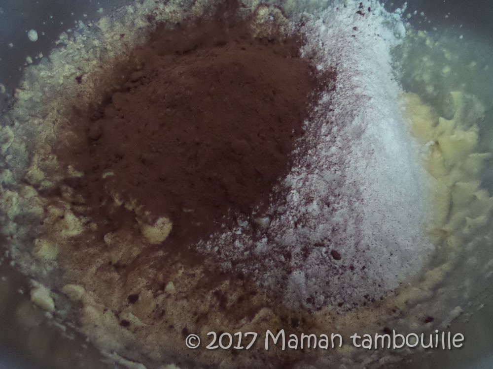 Ajouter la farine et le cacao en poudre. Fouetter.