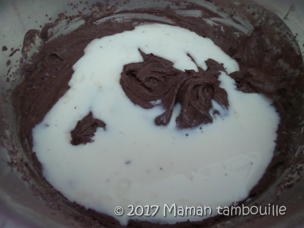 Ajouter le reste du lait et mélanger au fouet à main (ne plus utiliser le batteur électrique au risque de retapisser sa cuisine !).