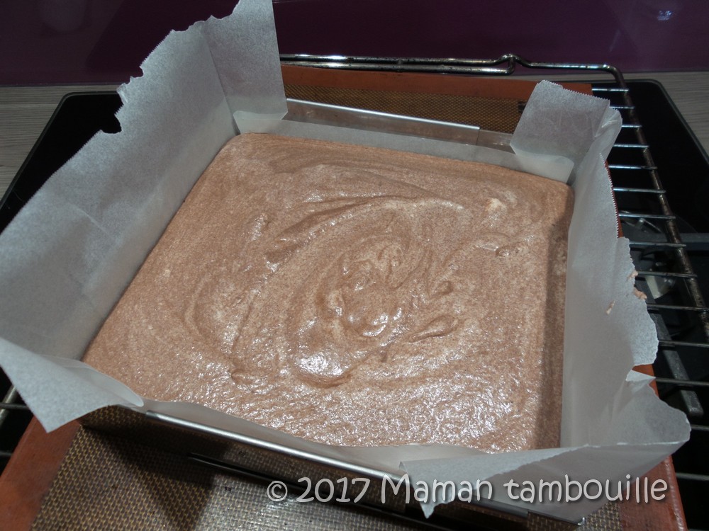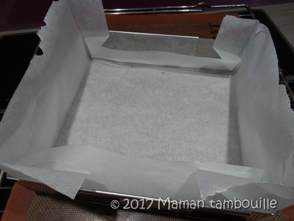 Préparer un cadre à pâtisserie de 20cm x 20cm (la taille est importante). Le couvrir de papier cuisson.