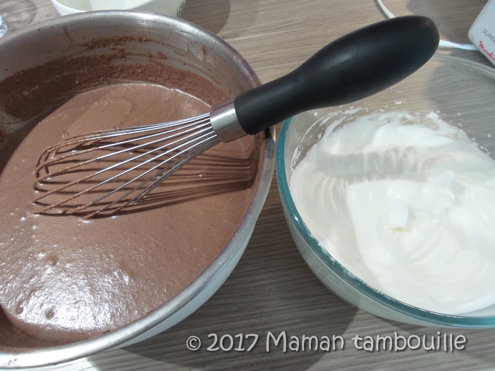 Verser les blancs dans la pâte et mélanger sans excès et délicatement.
