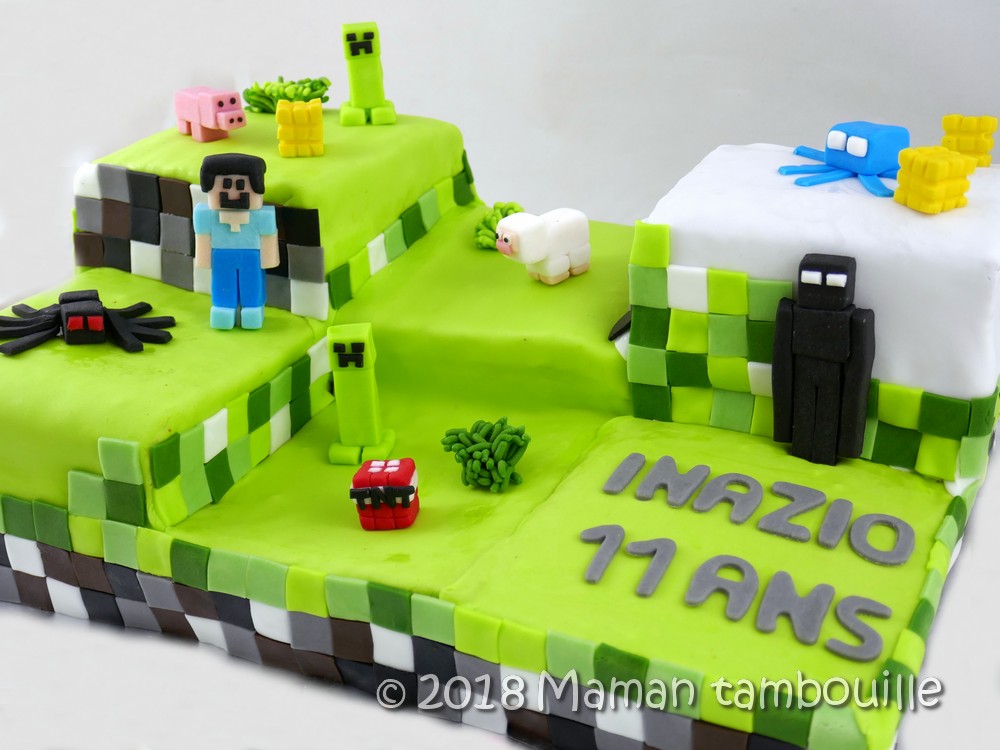 Cette année, il m’a commandé un gâteau Minecraft alors je me suis lancée dans la tâche des petits carrés multicolores et des personnages cubiques. Pour les gâteaux, j’ai choisi de faire un fondant au chocolat (je le fais tous les ans car ils l’adorent), un molly cake à la vanille et un gâteau au carambar.