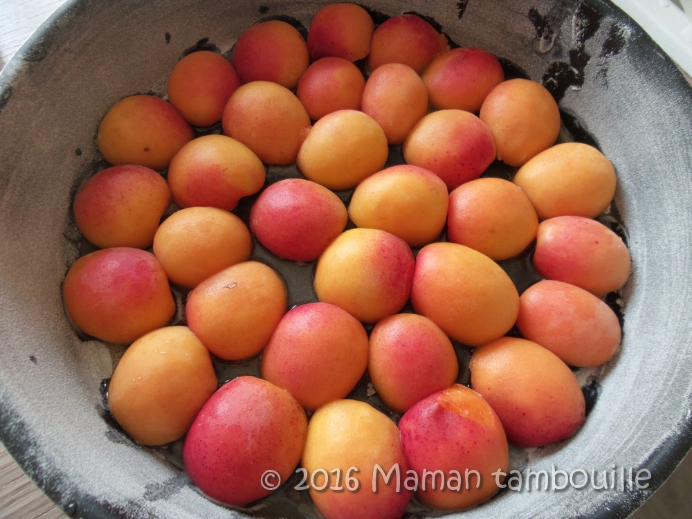 Déposer les demis abricots dans le fond du moule, face coupée sur le fond. Il faut bien les serrer dans le moule car ils vont se rétracter en cuisant.