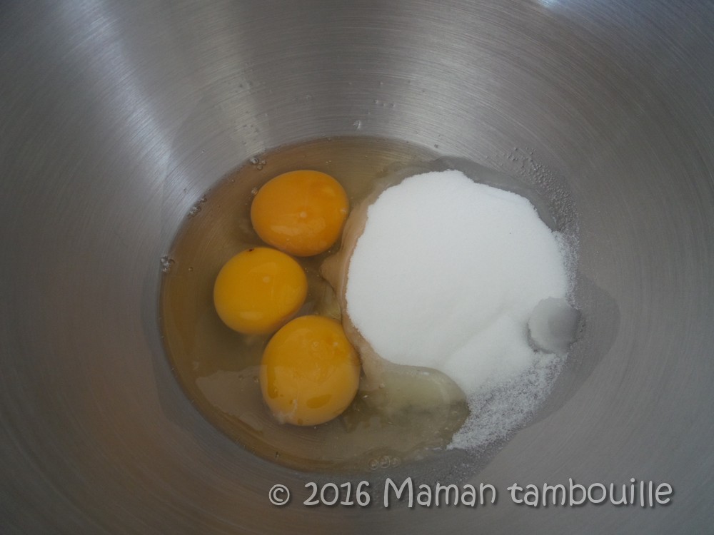 Dans un saladier, mettre les œufs et le sucre.