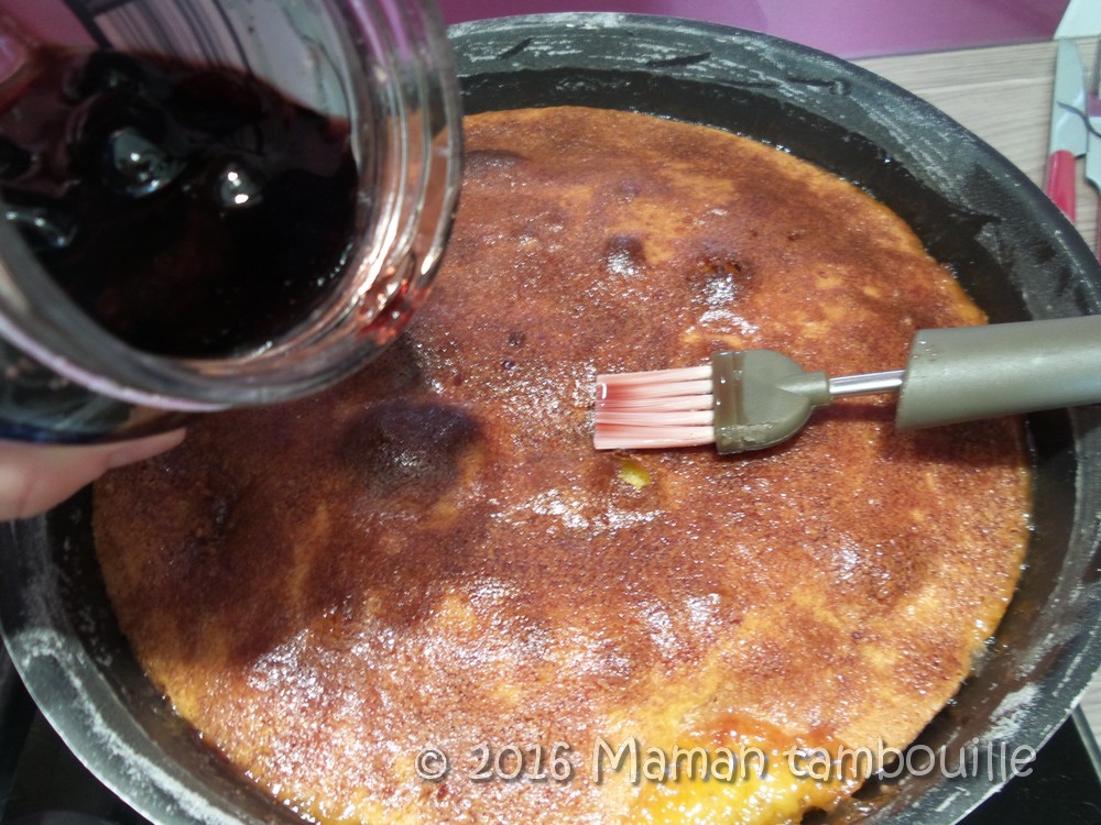 Sortir du four puis, à l’aide d’un pinceau, répartir le sirop de cerises amarena ou l’alcool sur toute la surface du gâteau.