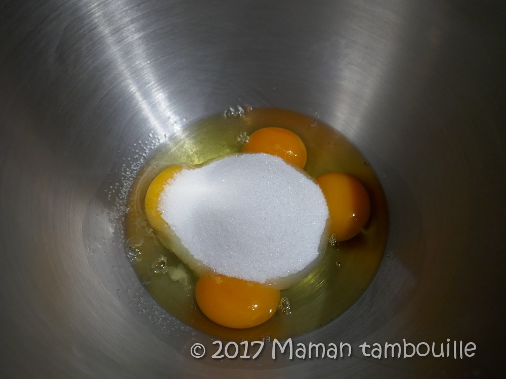 Dans un saladier, casser 2 œufs entiers et ajouter 2 jaunes (garder les 2 blancs à part). Ajouter 80g de sucre.