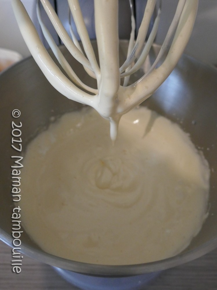Fouetter longtemps (5 min au moins) jusqu’à ce que le mélange blanchisse et triple de volume.