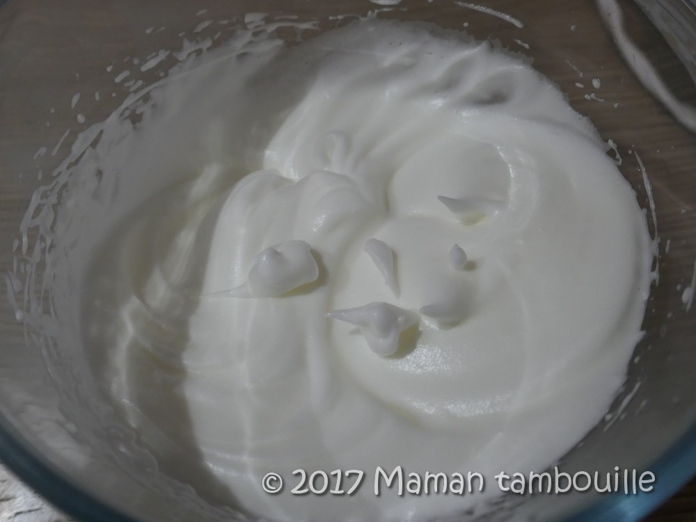 Dans un saladier, battre les 2 blancs en neige. Quand ils commencent à prendre, ajouter 20g de sucre et continuer de fouetter.