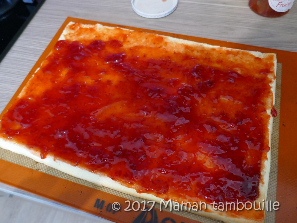 Tartiner aussitôt le biscuit de confiture en veillant à mettre beaucoup moins de confiture sur un des bords les plus longs (ici, tout en haut).