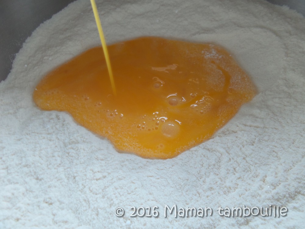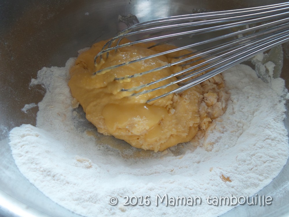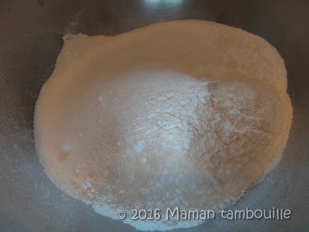 Dans un saladier, mettre la farine avec le sucre et la levure.