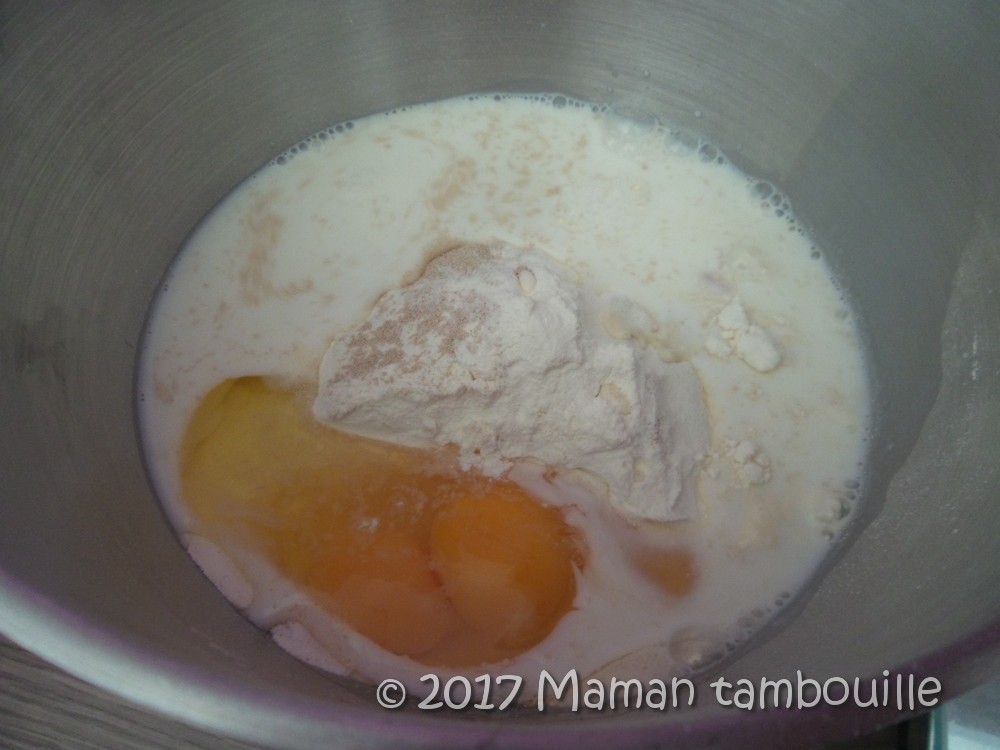 Dans le bol d’un robot pétrin, mettre le sel, la farine, la levure, les oeufs et le sucre en poudre.