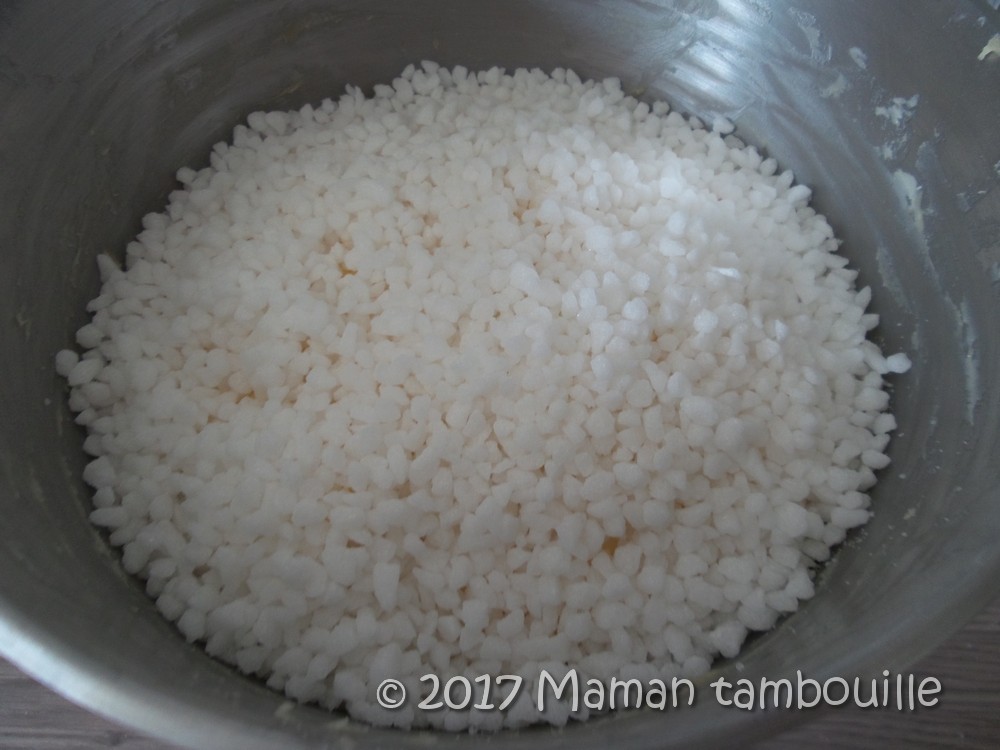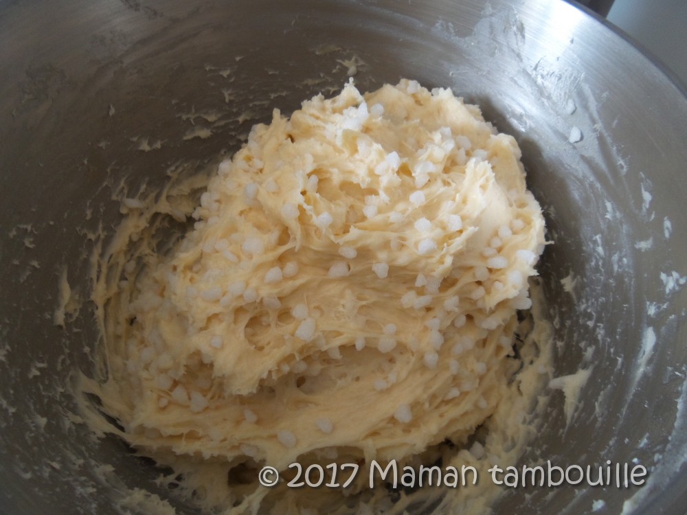 Quand la pâte a doublé de volume, ajouter le sucre perlé (oui, j’avoue, cela semble vraiment énorme cette quantité !).