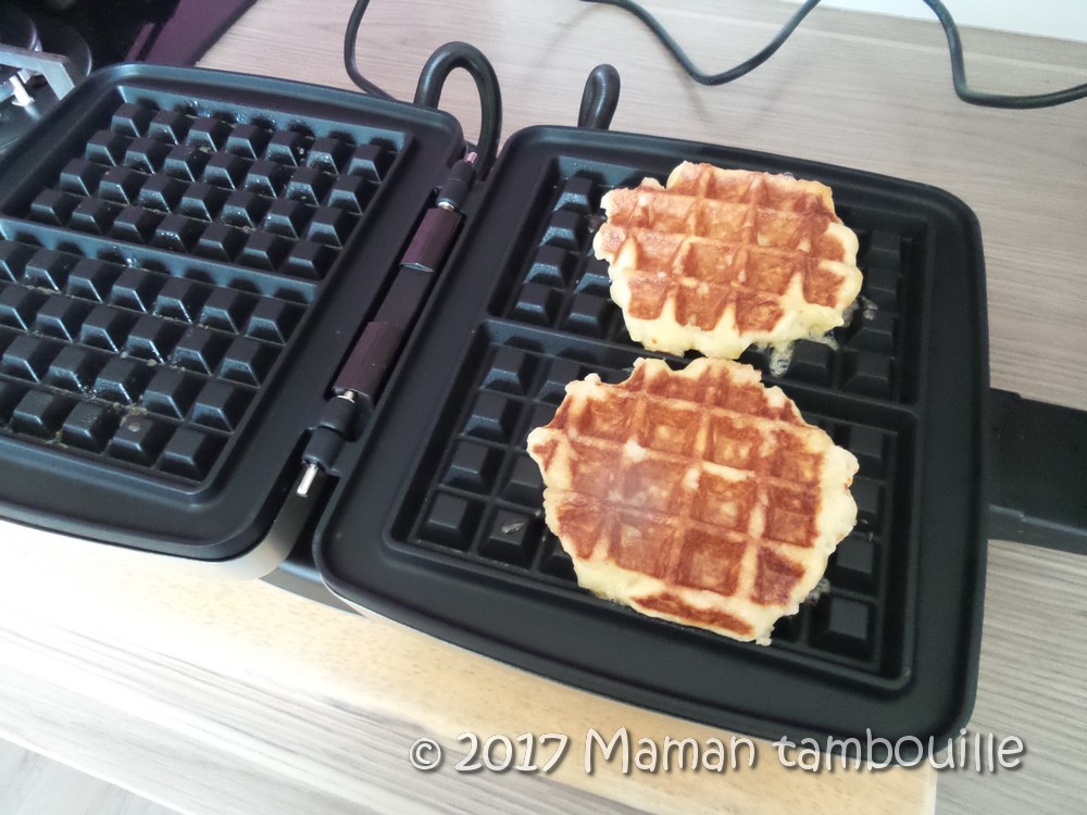 Déposer 2 boules de pâtes sur le gaufrier. Fermer sans appuyer, la pâte va s’écraser toute seule. Laisser cuire 2 min puis retourner le gaufrier et cuire à nouveau environ 2 min. Les gaufres doivent être dorées.