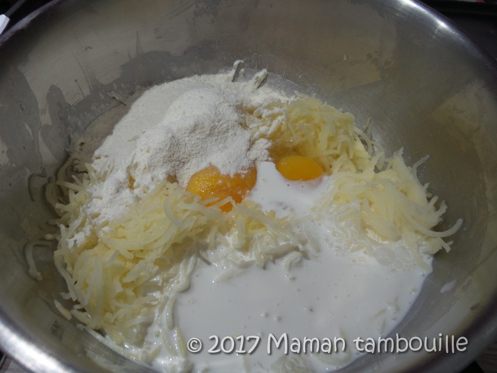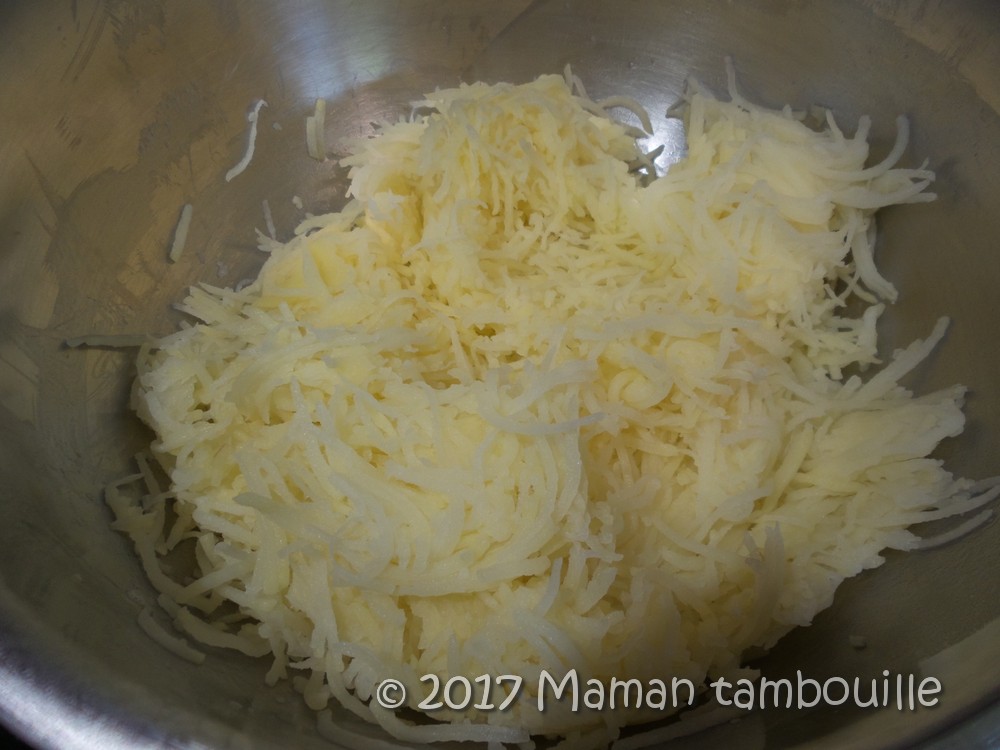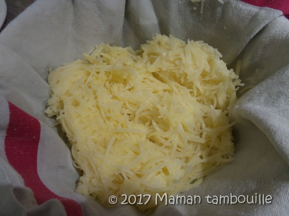 Presser au dessus de l’évier pour vider le jus à travers le torchon. Les pommes de terre râpées doivent être le moins humide possible.