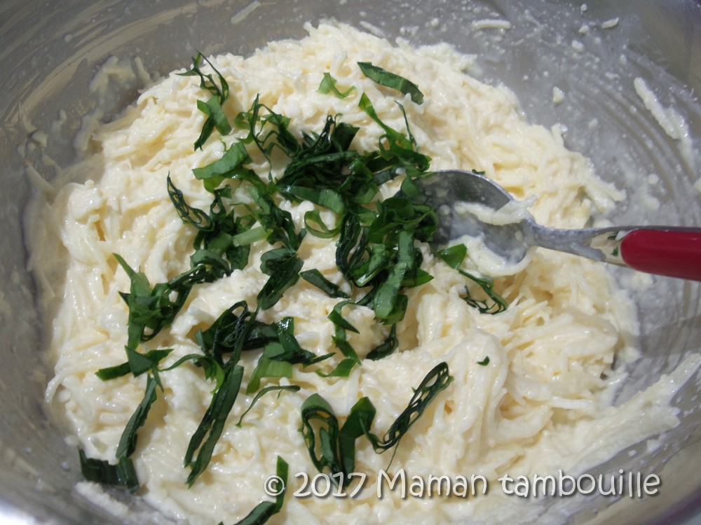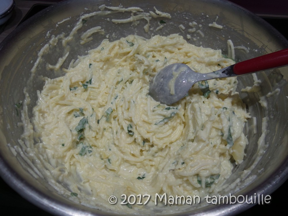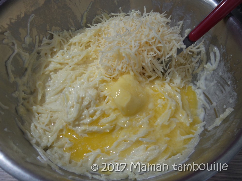 Ajouter l’emmental, le beurre fondu et saler généreusement. Bien mélanger.