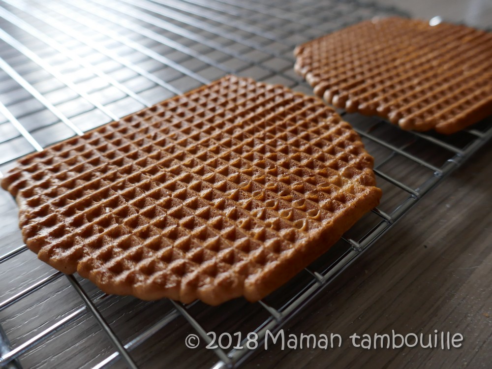 Cuire environ 3 min jusqu’à ce que les gaufrettes soient dorées. Les poser sur une grille et laisser totalement refroidir pour qu’elle durcisse.