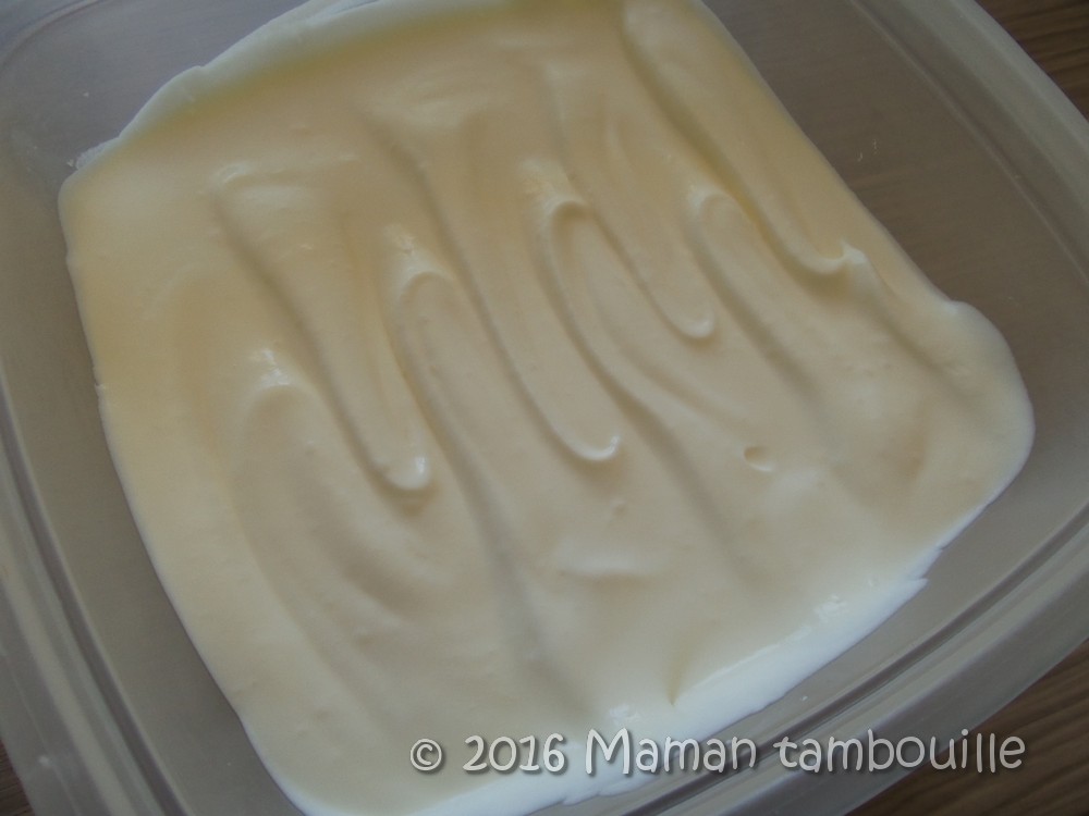 Mélanger délicatement avec une spatule et verser dans un plat. Couvrir et placer 6h au congélateur.
