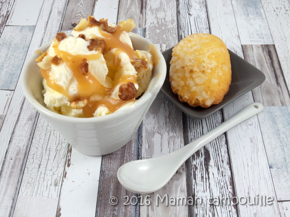 - Pour accompagner: du caramel au beurre salé, des éclats de chouchous et des madeleines aux perles de sucre Ker Cadélac reçues dans la dernière Degustabox) … au choix !