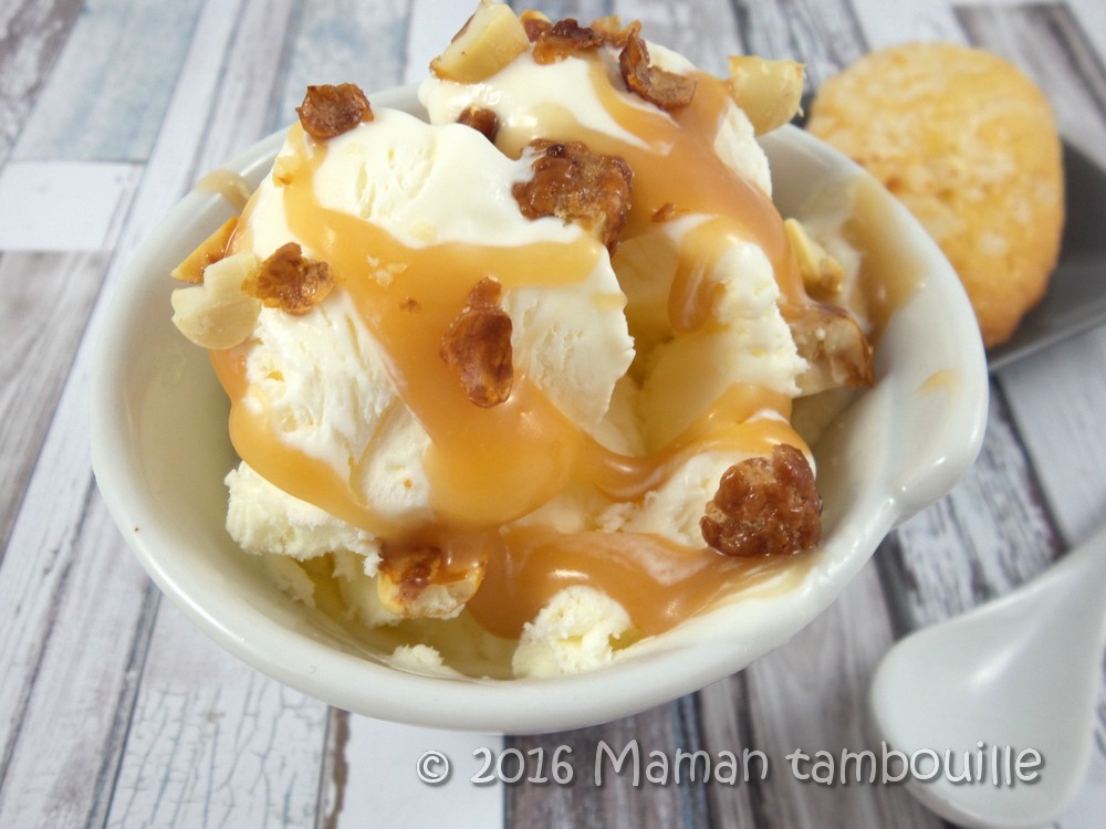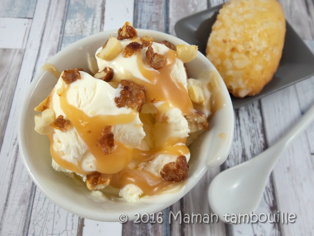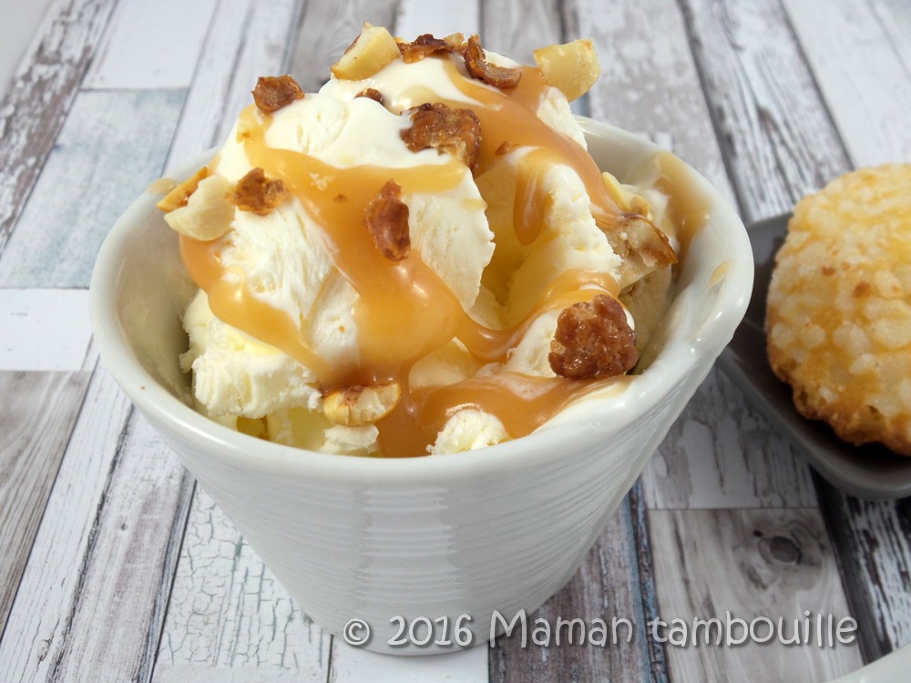 Cette glace étant « nature » (je n’y ai même pas ajouté de vanille), elle doit être accompagnée de différents topping pour prendre toute sa splendeur, pour moi du caramel au beurre salé et des éclats de chouchou. Un pur délice !!!!