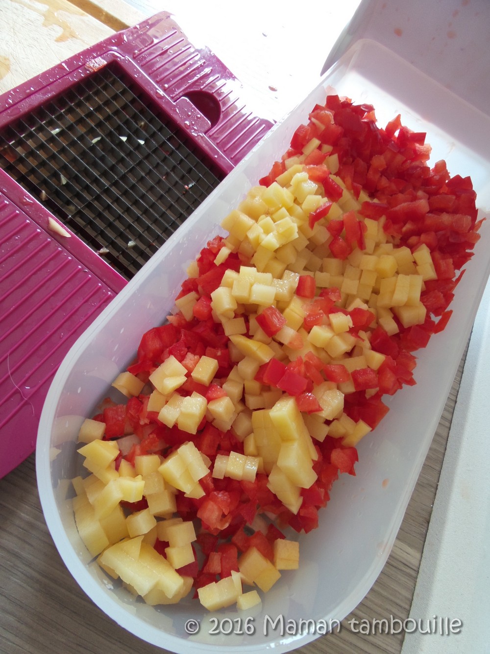 Couper la pomme de terre, le poivron et l’oignon en petits dés.