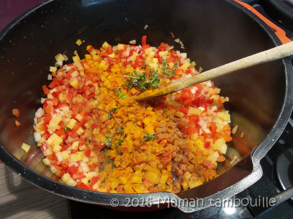 Mélanger et cuire à nouveau 5 min à feu doux. Réserver hors du feu et laisser un peu tiédir.