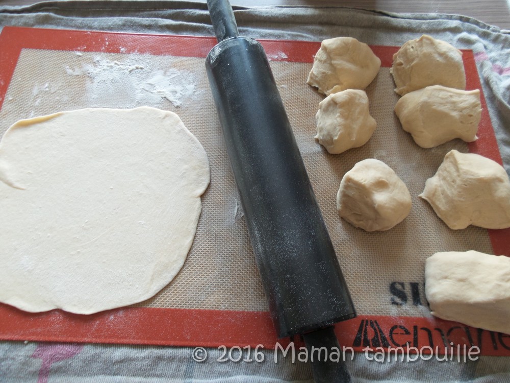 Dans le bol d’un robot pétrin, mettre dans l’ordre le beurre fondu, le lait tiède, le sel, la farine, le sucre et la levure au dessus. Mettre le robot en marche jusqu’à ce qu’une boule se forme. Couvrir d’un torchon et laisser lever 1h.