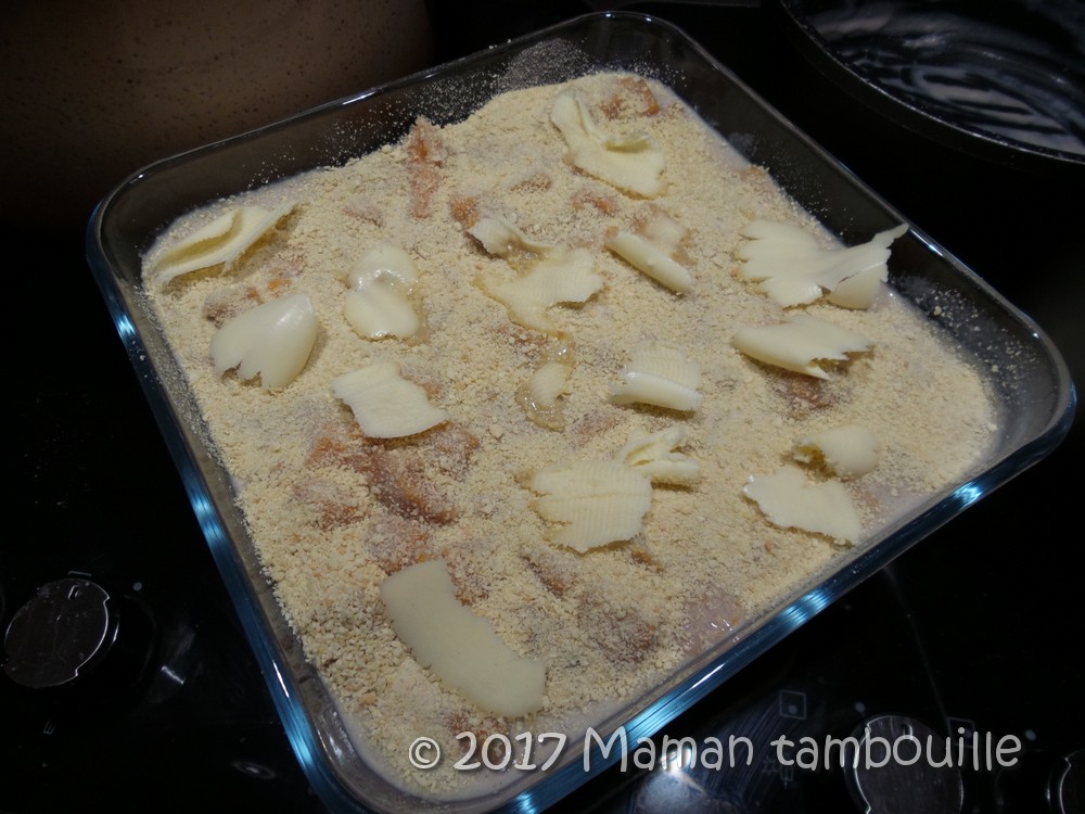 Saupoudrer de chapelure (ou de fromage râpé pour les plus gourmands) et ajouter quelques morceaux de beurre sur le dessus.