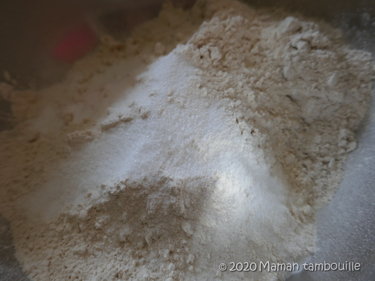 Dans un grand saladier, mélanger les farines, le sel et le bicarbonate.