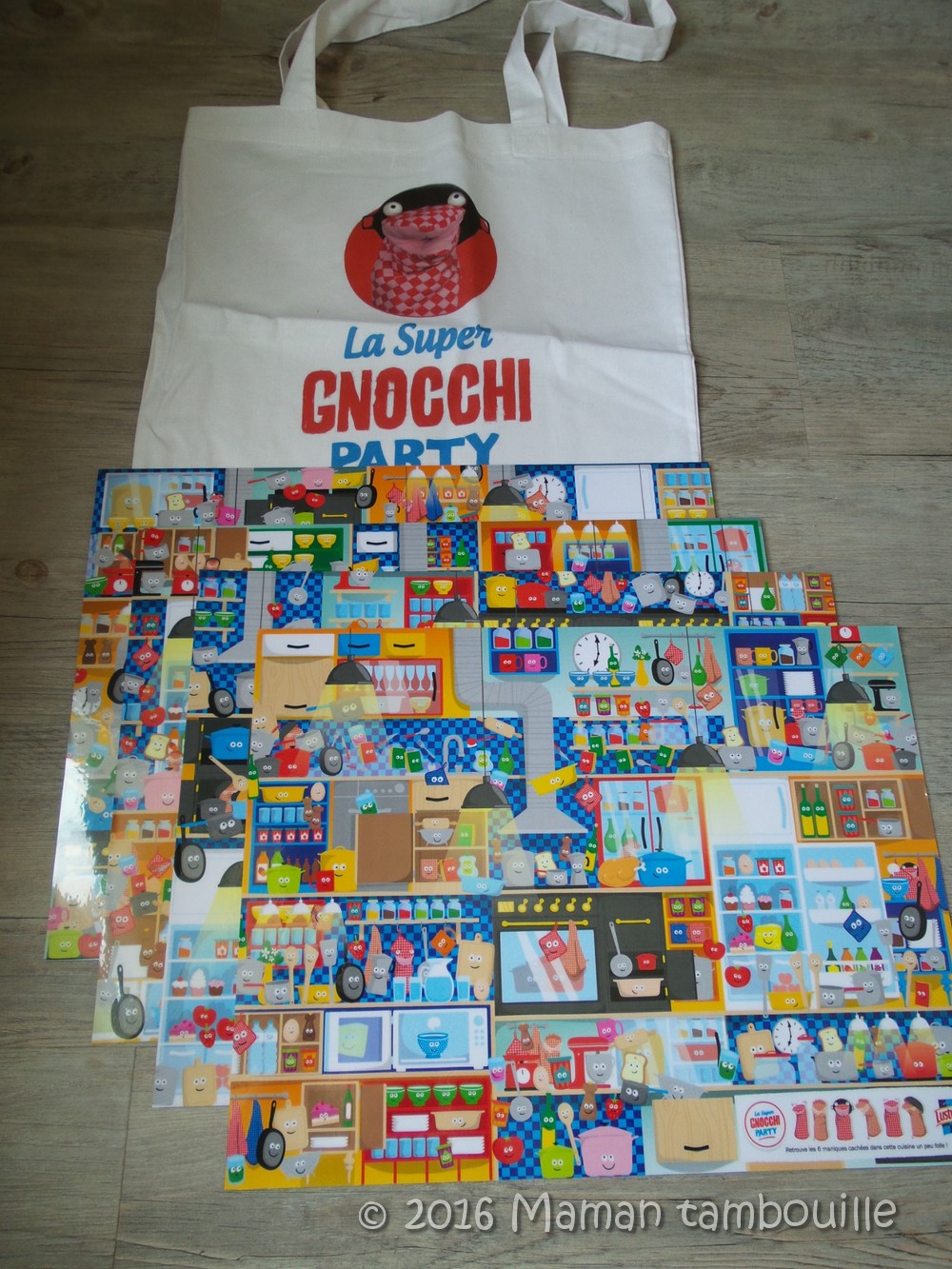 J’ai également reçu de Lustucru un lot de 4 sets de tables plastifiés avec des jeux pour occuper les enfants qui attendent à table ainsi qu’un sac en tissu.