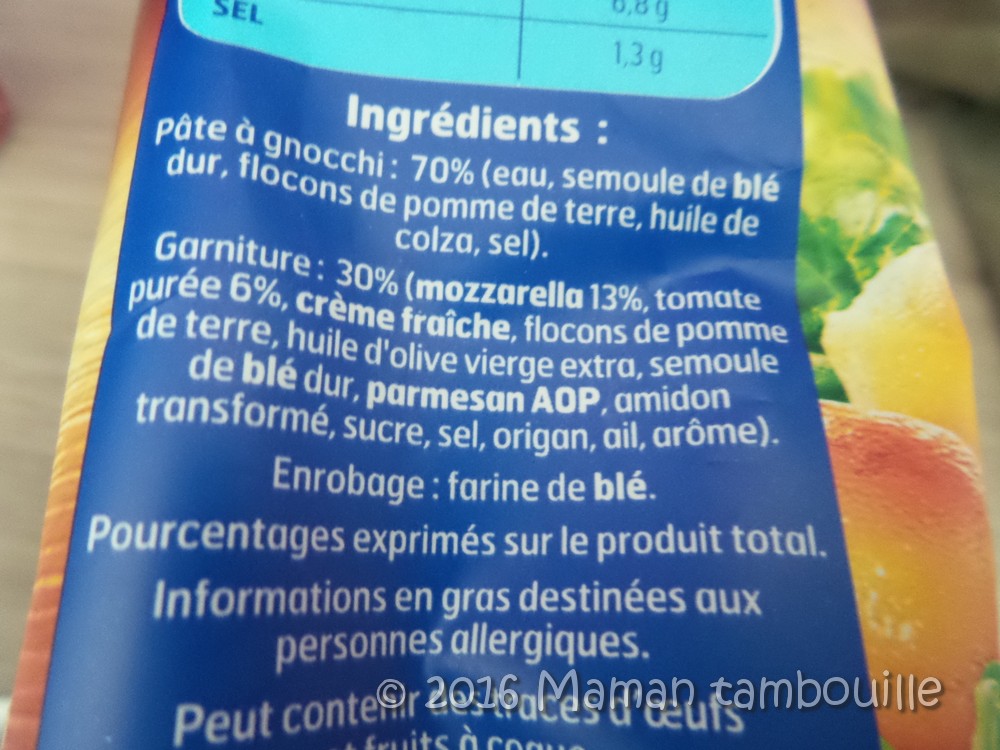 - la pâte à gnocchi contient de la semoule de blé, de l’eau, des flocons de pomme de terre, du sel et de l’huile de colza (pas d’huile de palme donc). Pour l’instant, tout va bien, on retrouve les ingrédients classiques d’une pâte à gnocchi, pas d’additifs, de conservateurs ni d’exhausteurs de goût.