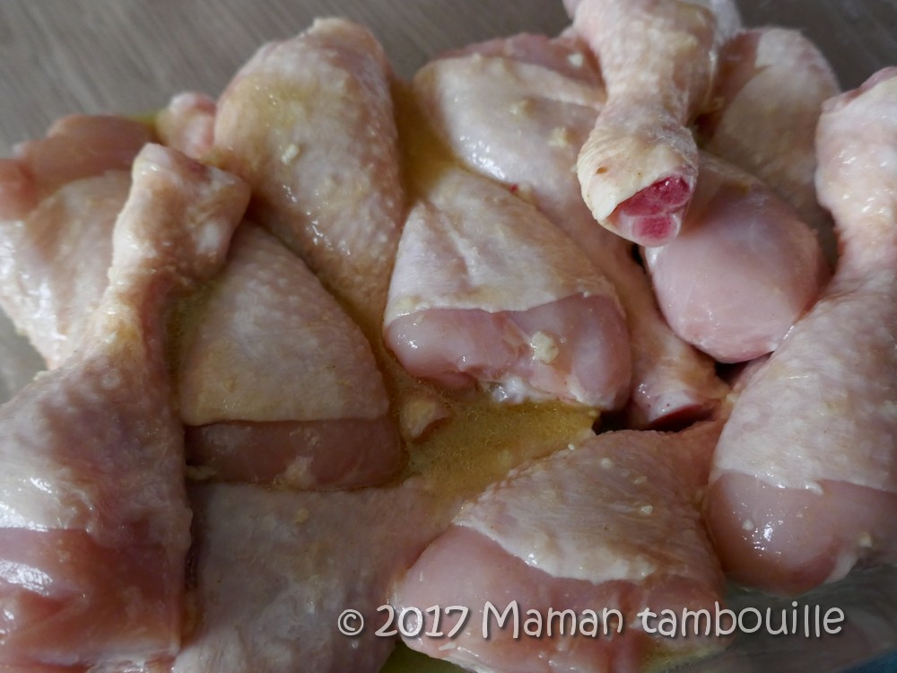 Malheureusement, les restaurants n’en proposent pas à chaque fois alors Papa Tambouille me tanne depuis des années pour que j’en fasse à la maison. Alors que je maîtrise la sauce à l’ail, je n’avais jamais tenté les ailes de poulet. Pourquoi ? Et bien tout simplement parce que je n’ai jamais réussi à trouver des petites ailes de poulet en magasin. Les seules que je déniche sont les ailes au paprika que l’on trouve en été pour griller au barbecue mais, des ailes natures, non je n’en trouve désespérément pas. Comme vous pouvez le constater sur la photo, je me suis finalement rabattue sur des petits pilons. C’est mieux avec des ailes mais, pas grave, on fait avec ce qu’on a.