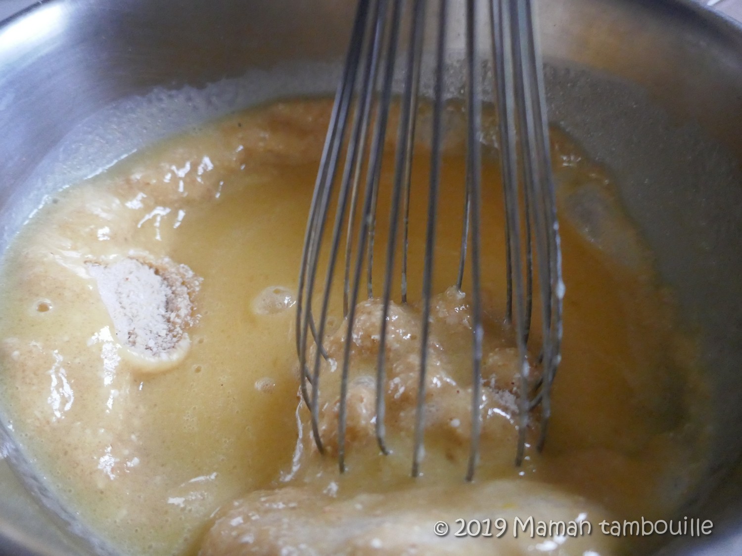 Verser le mélange d’oeuf et huile et mélanger au fouet toujours sans excès.