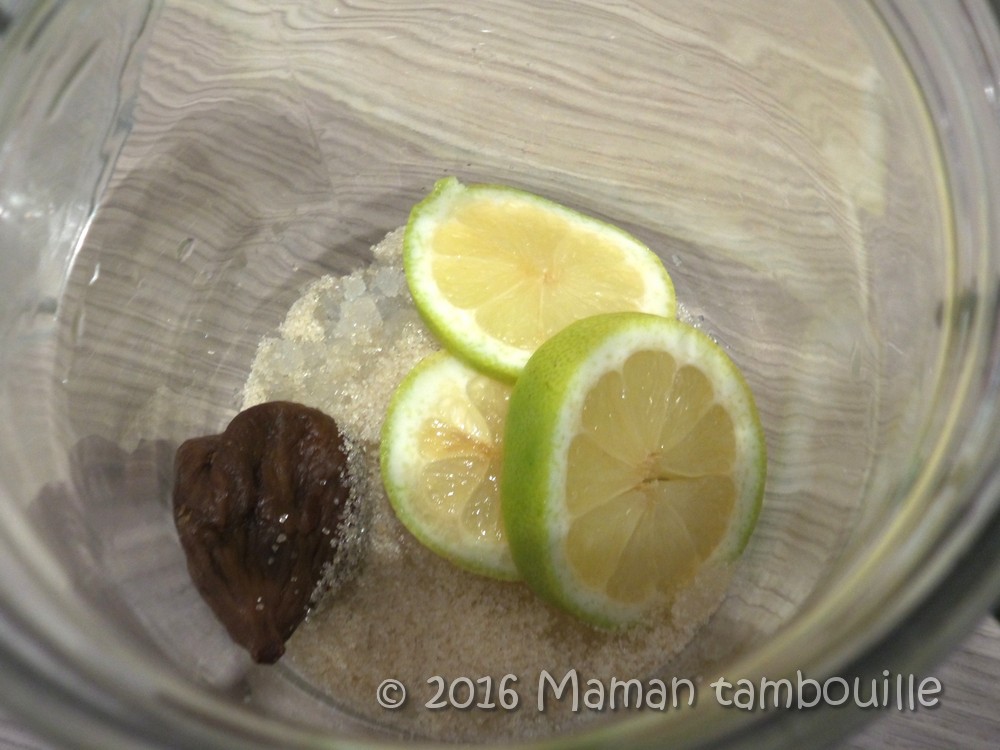 Quand la figue est remontée, la retirer du pot et la jeter ainsi que les rondelles de citron (on peut presser les tranches pour récupérer le jus, je ne le fais pas).