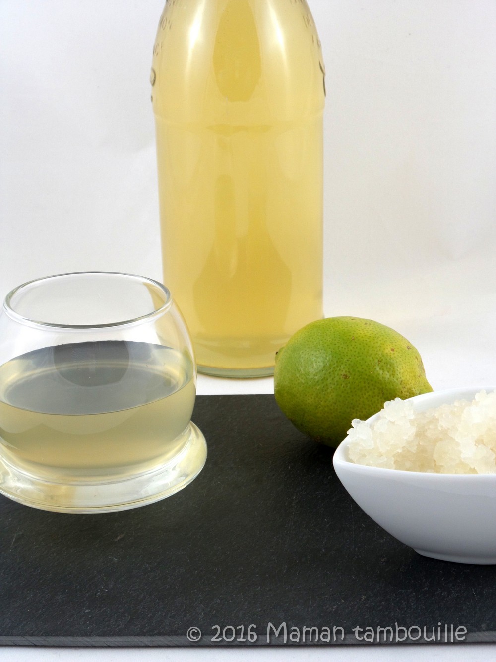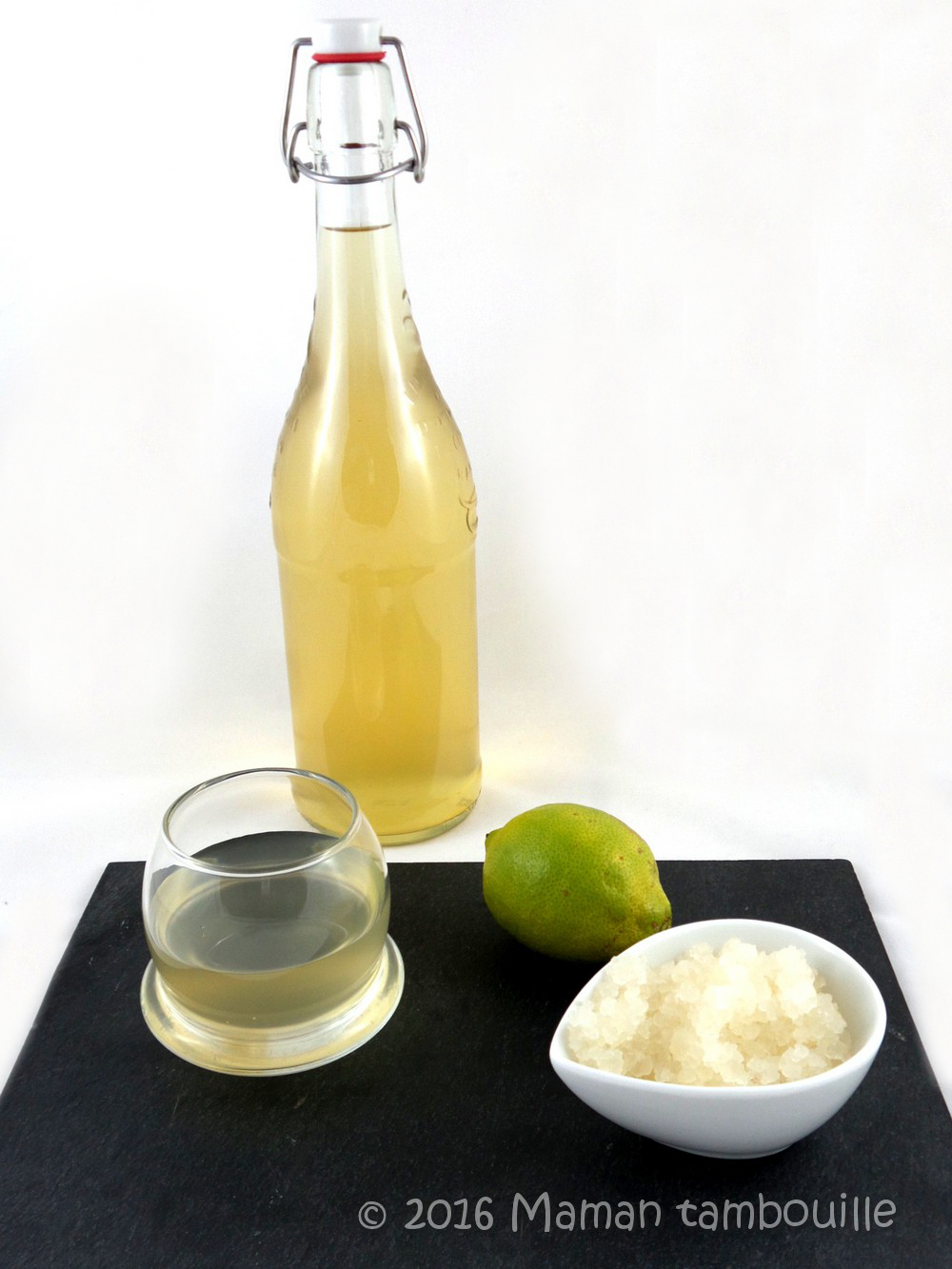• une bouteille en verre d’1L ou 1,5L type bouteille ancienne à limonade avec un bouchon à levier fixé à la bouteille (car il peut y avoir de la pression dans la bouteille à cause du gaz et le bouchon pourrait sauter comme pour une bouteille de cidre).
