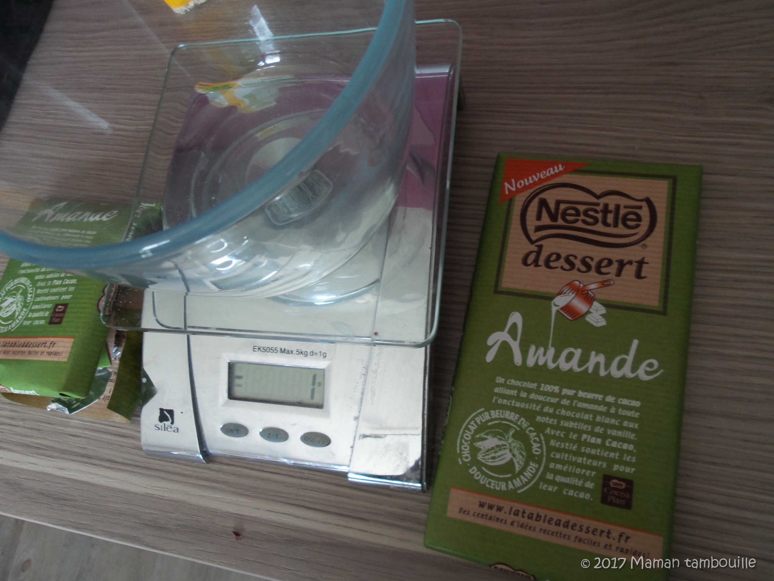 • 150g de chocolat blanc pâtissier (j’ai mis le chocolat amande de Nestlé dessert qui donne une saveur parfaite dans ce cas)