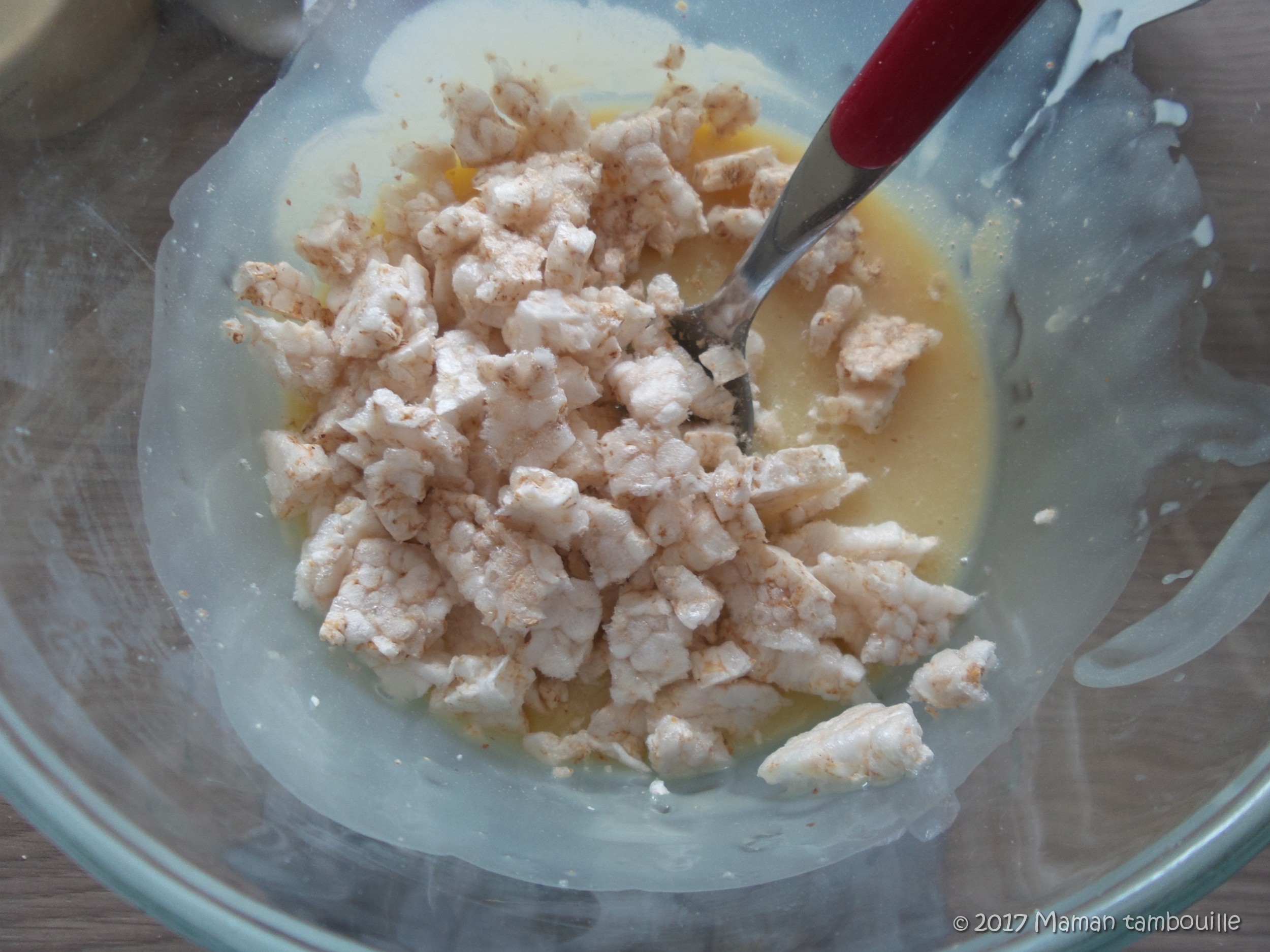 Emietter grossièrement les galettes de riz et les mettre dans le saladier. J’ai commencé avec 2 galettes mais comme elles étaient très fines j’en ai rajouté 2 autres.