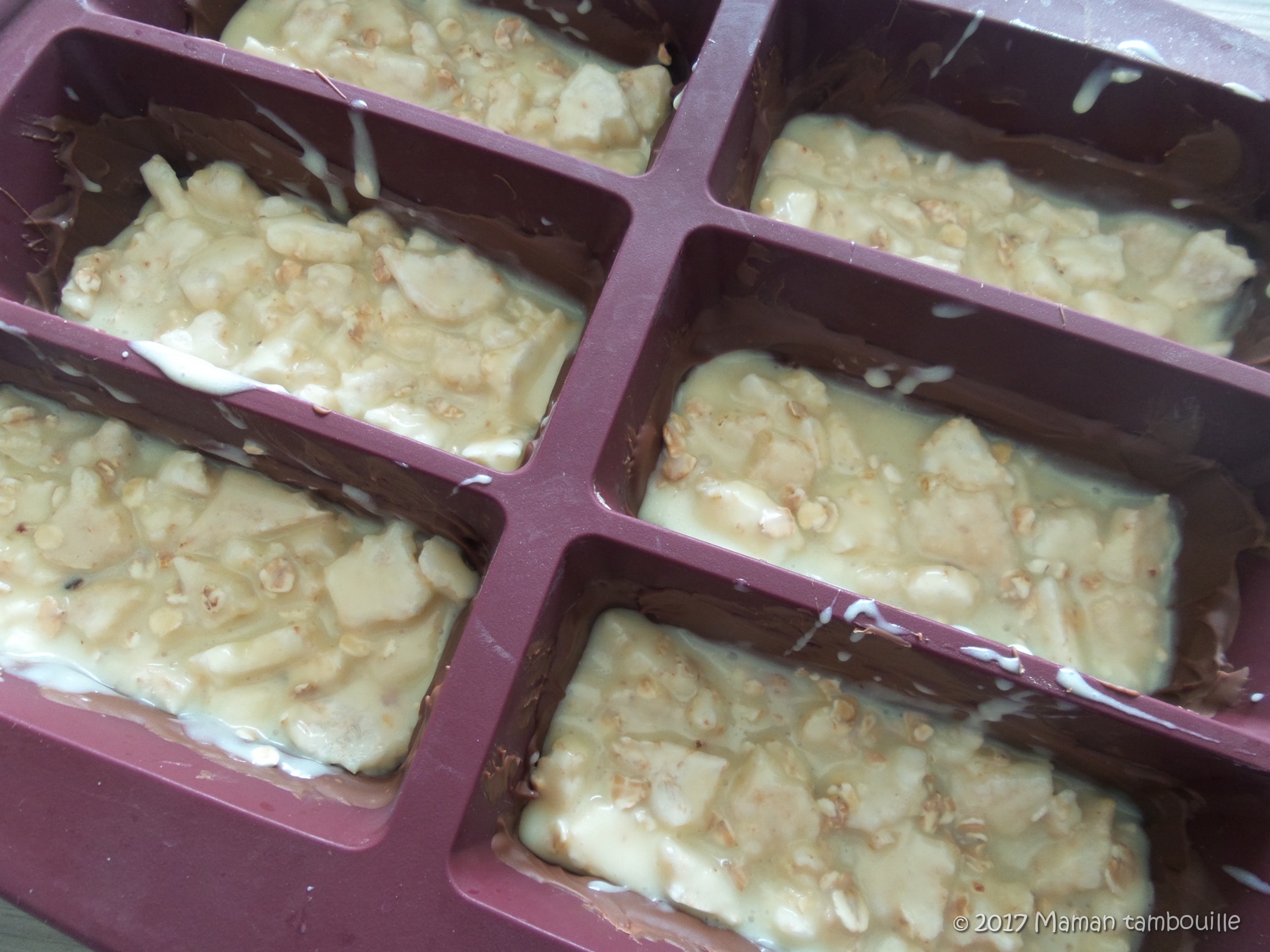 Sortir le moule du congélateur et garnir de chocolat blanc/céréales en tassant un peu. Remettre 10 min au congélateur.