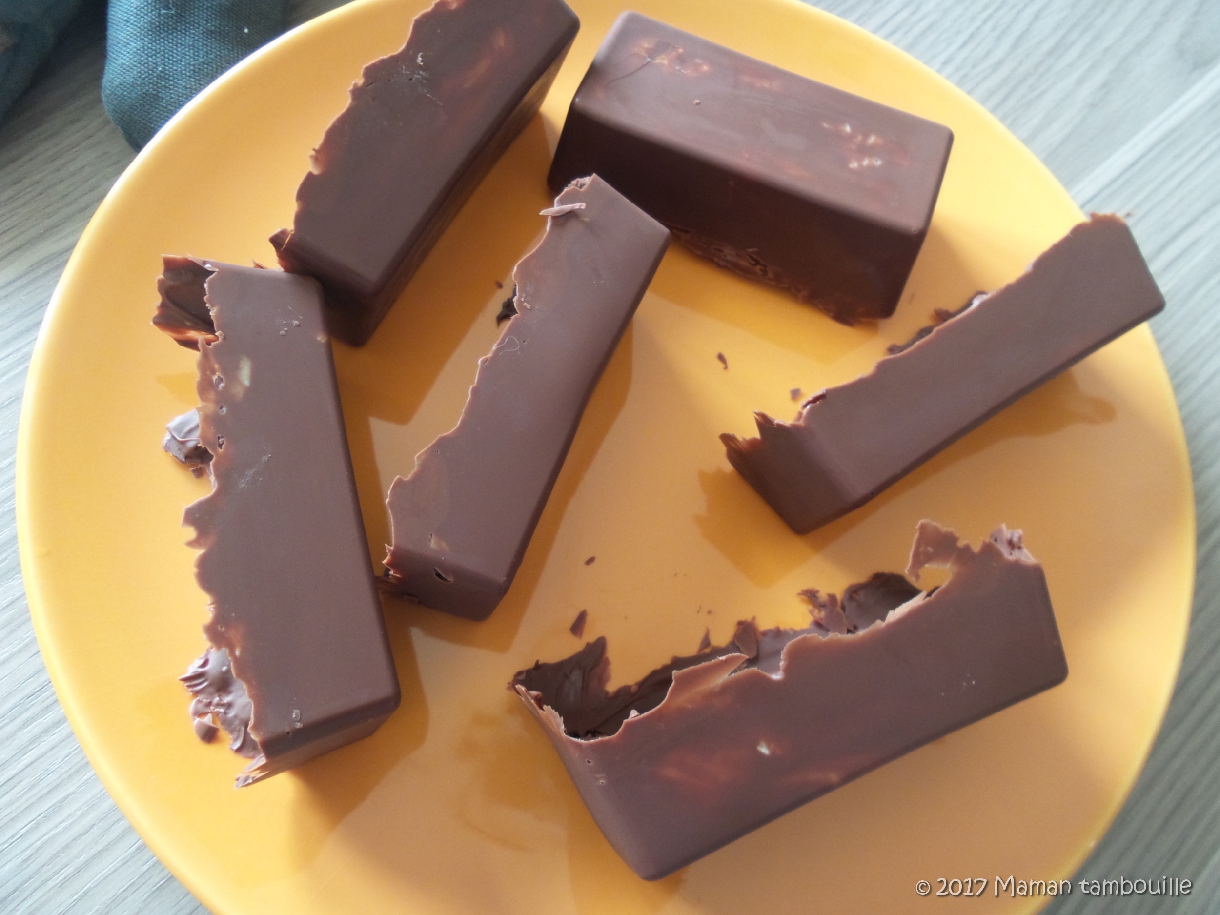 Démouler délicatement et poser sur une assiette. Les bords ne sont pas nets mais c’est pas grave. On prend les barres dans la main (on se passe les mains sous l’eau bien froide avant pour ne pas faire fondre le chocolat) et, avec un petit couteau plat bien tranchant, on coupe l’excès de chocolat pour faire un bord net.