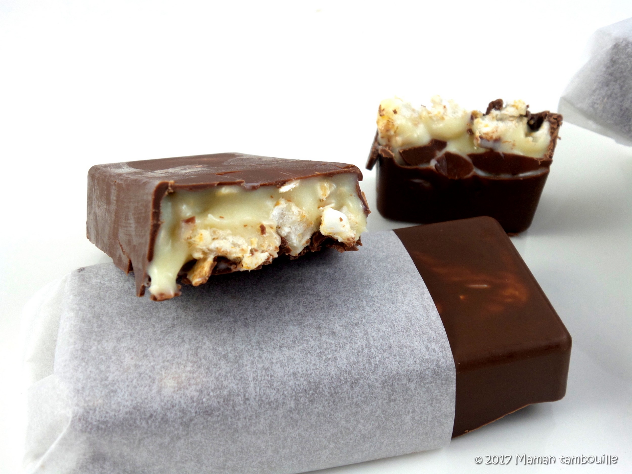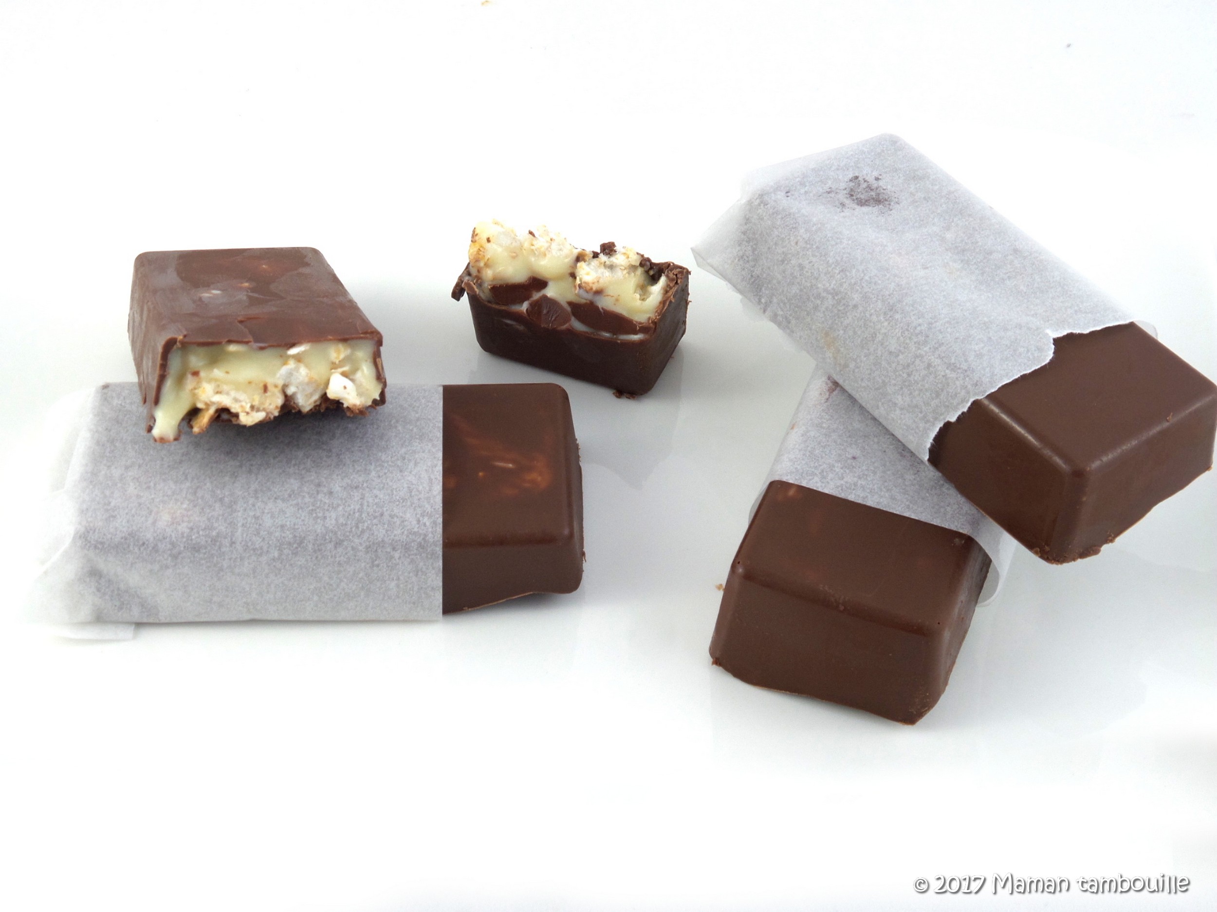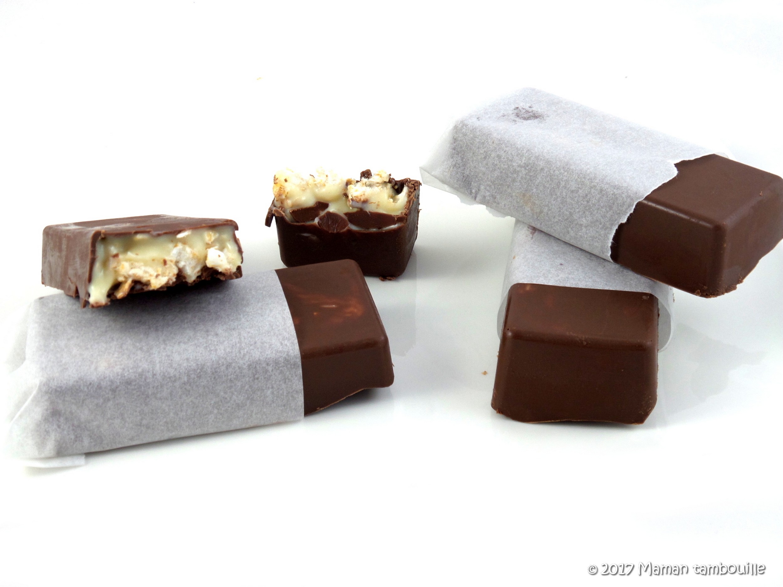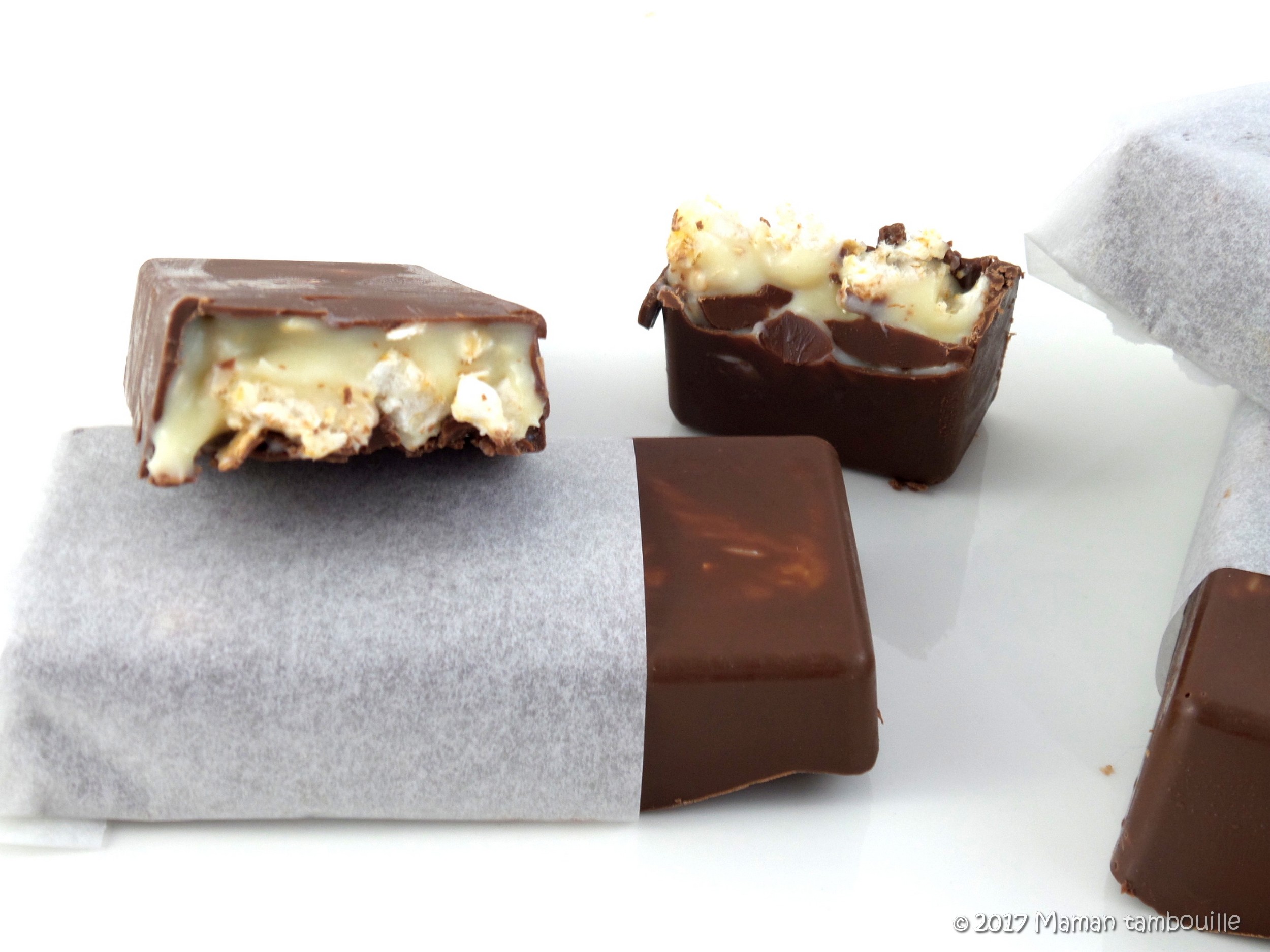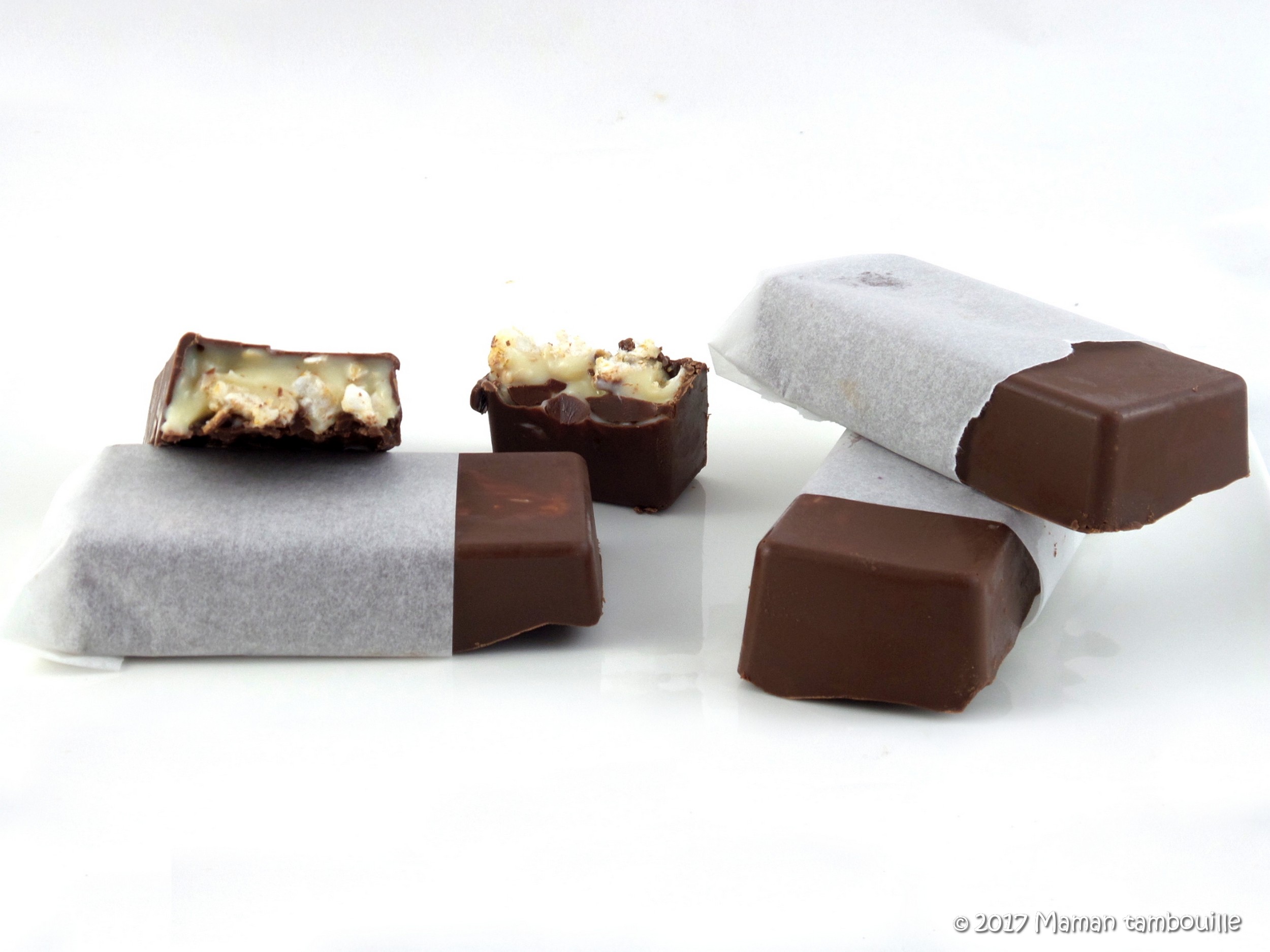 J’ai jeté mon dévolu sur la recette de Perle en sucre et j’ai fait quelques modifs. Ce n’est ni long ni compliqué à faire et le résultat est à la hauteur de mes attentes. Dommage que je n’ai pas de moule à petites tablettes de chocolat pour un visuel plus  ressemblant mais c’est pas grave. Tout a été mangé avec plaisir.