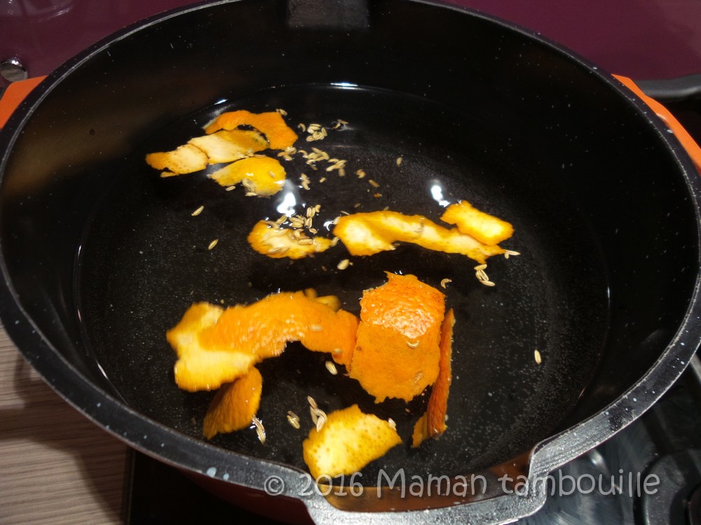 La matin pour le soir (ou la veille au soir pour le lendemain midi), mettre 2 litres d’eau dans une cocotte. Ajouter le gros sel, le bouquet garni et le zeste de l’orange bio. Porter à ébullition et maintenir l’ébullition 5 min.