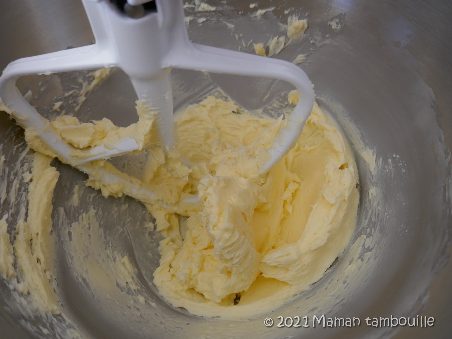 Une fois les 3 préparations à la même température, mettre le beurre dans un robot avec le fouet plat. Fouetter pour rendre le beurre bien crémeux et sans morceaux.