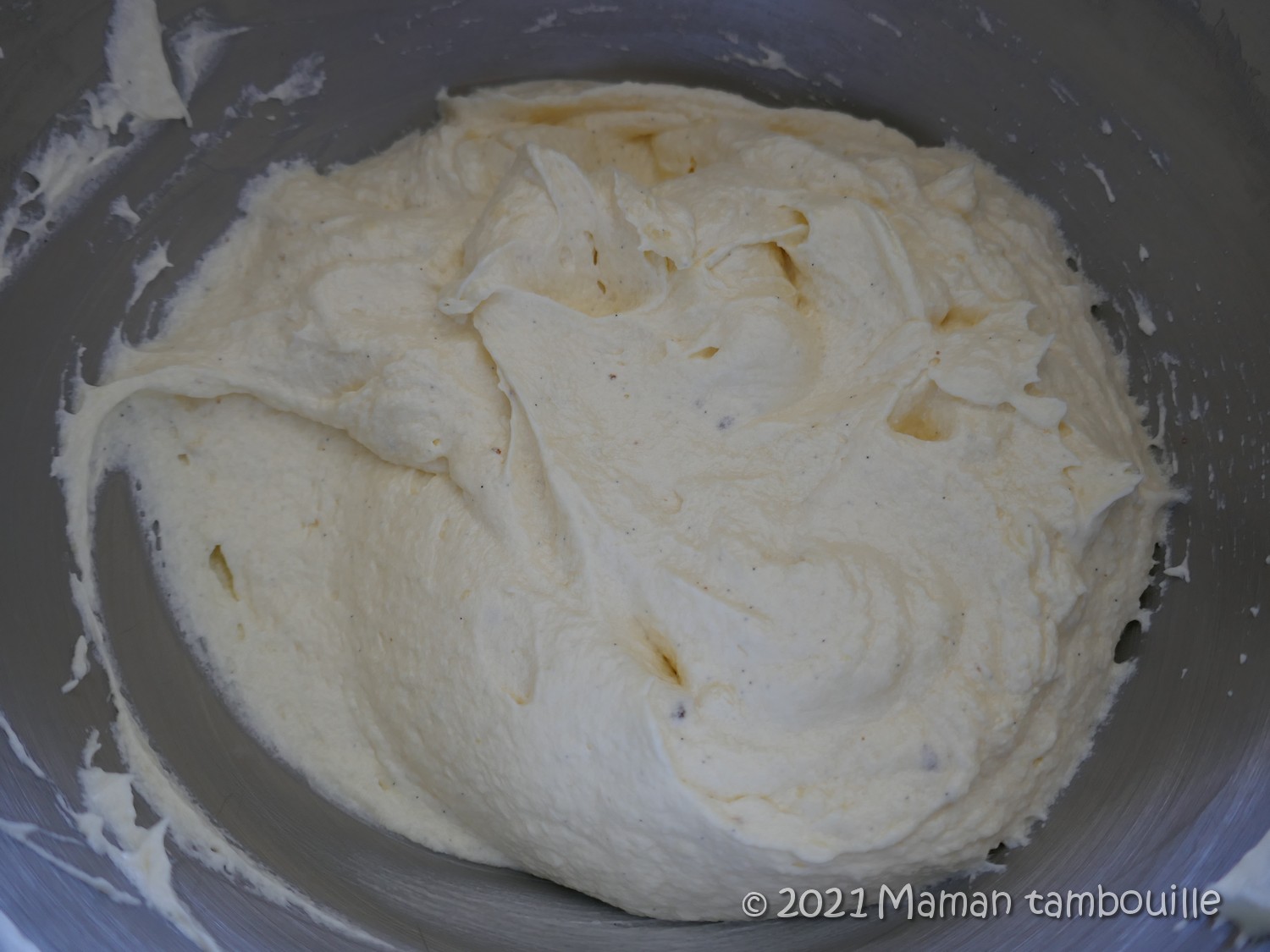 Remettre le robot en marche puis ajouter la crème pâtissière cuillère par cuillère.