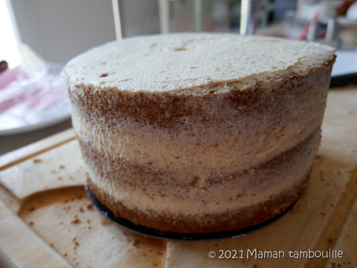 Avec le reste de crème, recouvrir le gâteau en bouchant les côtés. Lisser sur le tour et le dessus.