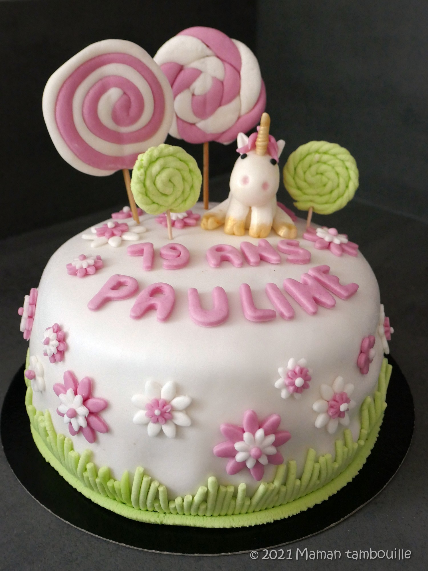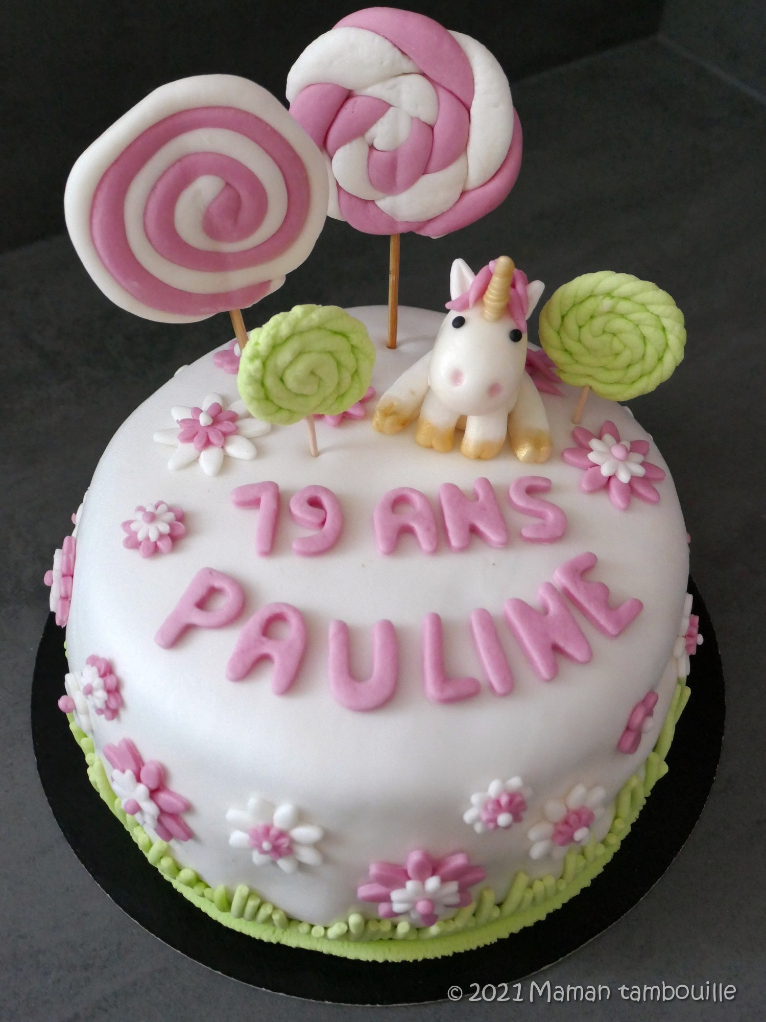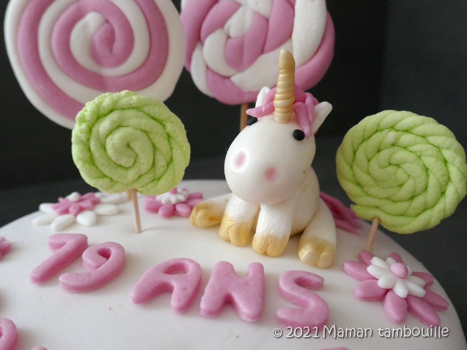 Pour la déco, licorne, fleurs et sucettes en pâte à sucre MAISON !!! Une première pour moi que la pâte à sucre maison mais surement pas une dernière. Facile à faire, à modeler et meilleure que celle du commerce. Je vous livrerai la technique bientôt.